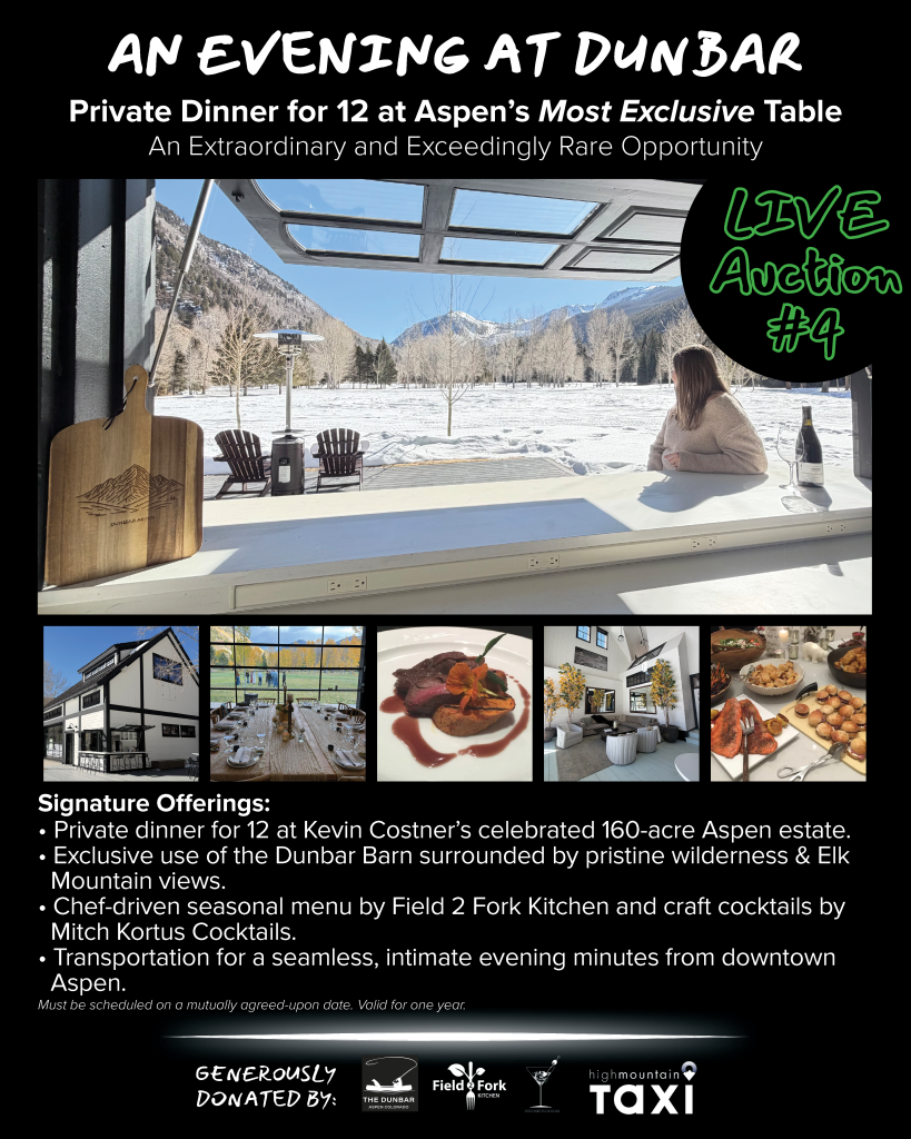 An Evening at Dunbar – Host an unforgettable evening at Kevin Costner’s celebrated Aspen estate, nestled on 160 acres of pristine wilderness just minutes from downtown. Surrounded by sweeping views of the Elk Mountains, private lakes, and iconic Aspen peaks, this is a rare opportunity to gather in one of Colorado’s most storied ranch settings. Enjoy an exclusive dinner for 12 in the Dunbar Barn, featuring a chef-driven, seasonal menu by Field 2 Fork Kitchen. With shuttle transportation included, your once-in-a-lifetime evening under the Colorado sky will be seamless, intimate, and truly extraordinary.