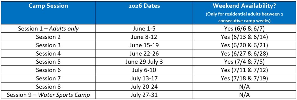 *Ascendigo cannot accept children under the age of 7. - Adults (age 18+): Session 1-8: Residential or Day Camp