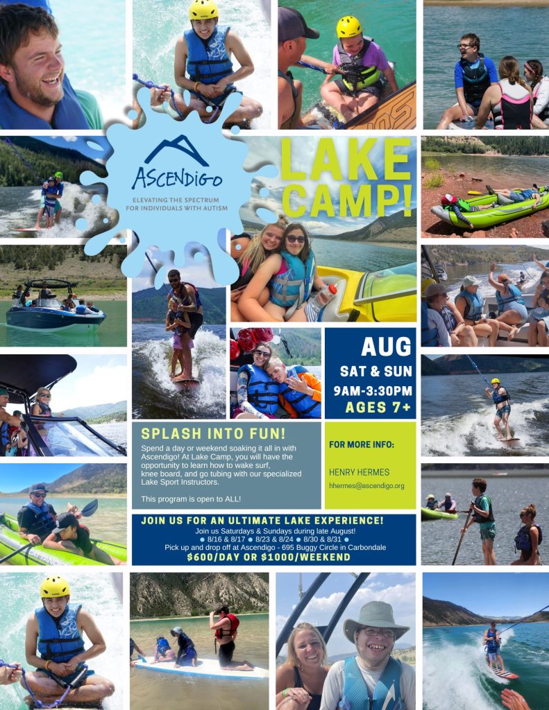 Splash into FUN at Lake Camp! Join us for an ultimate lake experience Saturdays & Sundays in late August. This popular Adventures program is for ages 7+ and you can choose to spend a day or a weekend soaking it all in with Ascendigo! At Lake Camp, you will have the opportunity to learn how to wake surf, knee board, and go tubing with our specialized Lake Sport Instructors. This program is open to ALL! For more info contact Henry Hermes at hhermes@ascendigo.org.